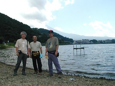 河口湖畔にて(バックに富士山の稜線が見えます)