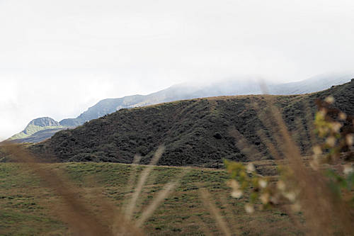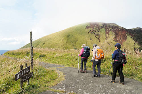 草千里との分岐(バックは烏帽子岳) こちらは中岳・皿山方面(頂上はガスで見えない)