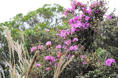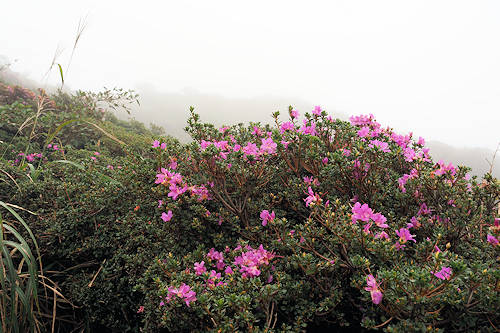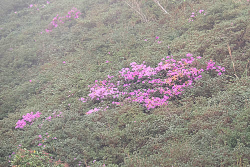 対面の斜面にもミヤマキリシマが ガスの中に頂上が見える