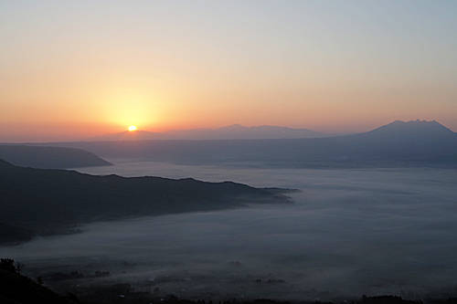 ご来光と雲海(右端は根子岳):ミルクロードより   牧ノ戸峠登山口(‏‎7:57:38)