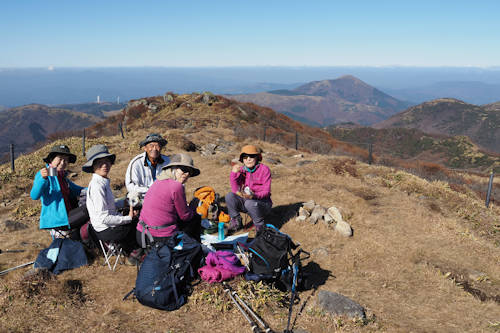 楽しいランチ(遠くに涌蓋山) 下山開始(‏‎11:44:02)正面星生山