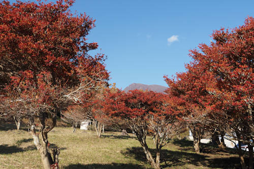 青空に赤が映える 長者原と遠くに由布岳が見える