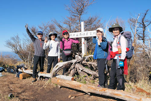 時間は猟師山まで1時間32分(合頭山経由)、南峰まで1時間55分、頂上滞在55分、下山は1時間10分でした。