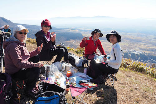 こんな景色を前に(左から傾山~祖母山、下は瀬の本高原、右は阿蘇五岳)ランチです(最高の贅沢)